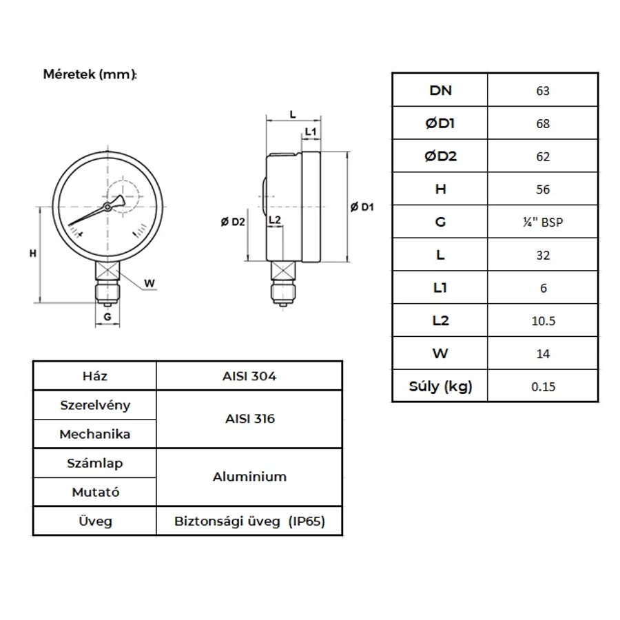 Manométer || AISI 304 ház || d=63mm || 0-6 bar || alsó csatlakozás